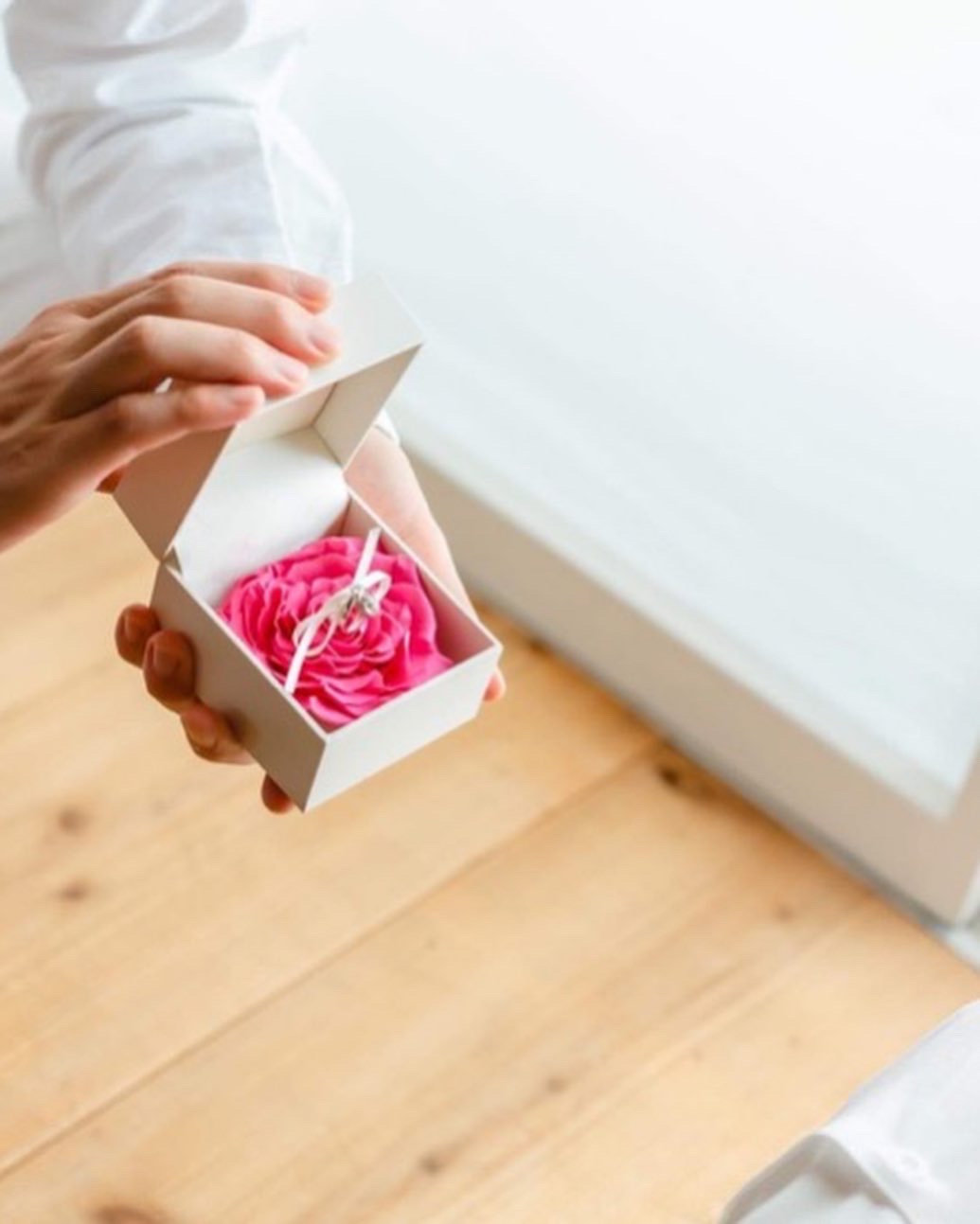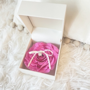 プリザーブドフラワーのバラの花びらを幾重にも重ねて1つの大輪のバラを作ったローズメリアをボックスに収めています。